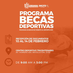 A partir de este lunes 10 al 14 de febrero en horario de 9:00 a 15:00 horas en el centro deportivo Tricentenario, se llevará a cabo el período de recepción de documentos para interesados en solicitar una Beca de Fomento Deportivo que otorga el Gobierno Municipal de Chihuahua.
