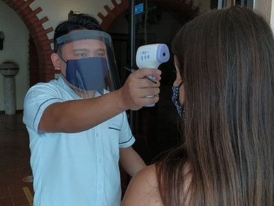 En el hotel se implementaron protocolos de entrada como la desinfección de Pies y maletas, toma de temperatura en la entra de huésped, uso del gel antibacterial en todo momento, un pre-check in en línea para evitar el contacto mínimo con el personal, así como señaléticas en los pasillos y la desinfección antes, durante y después de la visita de los huéspedes en las habitantes.