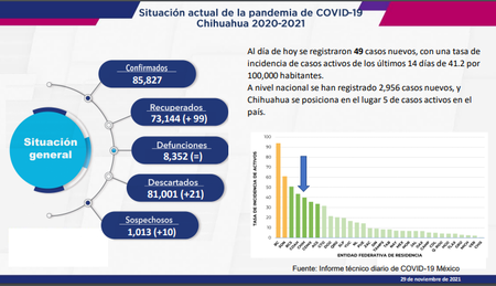 El Gobierno del Estado, a través de la Secretaría de Salud de Chihuahua, presenta este 29 de noviembre el reporte COVID-19, en el cual se registran 85 mil 827 (+49) personas confirmadas en la entidad por este padecimiento, 73 mil 144 (+99) casos recuperados, 81 mil 001 (+21) descartados y 1,013 (+10) casos sospechosos.