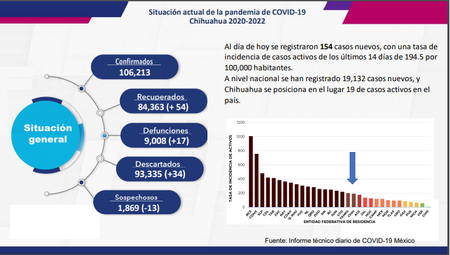 A nivel nacional se tiene un registro de 19 mil 132 casos nuevos y Chihuahua se posiciona en el lugar número 19 de casos activos en el país, por lo cual posee una tasa de incidencia de casos activos de los últimos 14 días, de 194.5 por cada 100 mil habitantes.