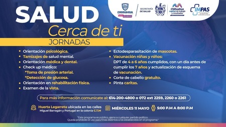 Para más información sobre los servicios del IMPAS, puede comunicarse al número 614-200-4810 o al 072, extensiones 2259, 2260 o 2261, en un horario de 08:00 de la mañana a 8:00 de la noche de lunes a viernes.