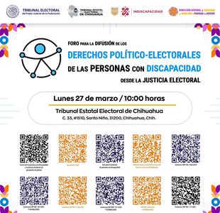 La Sala Superior del TEPJF a través de su Dirección General de Igualdad de Derechos y Paridad de Género y el TEE, invitan este lunes 27 y martes 28 de marzo a los Foros: "Difusión de los Derechos Político-Electorales de las Personas con Discapacidad desde la Justicia Electoral" y “Promoción de los derechos político-electorales de la población LGBTTTI+”, a realizarse respectivamente en el Salón del Pleno del TEE a las 10:00 horas.